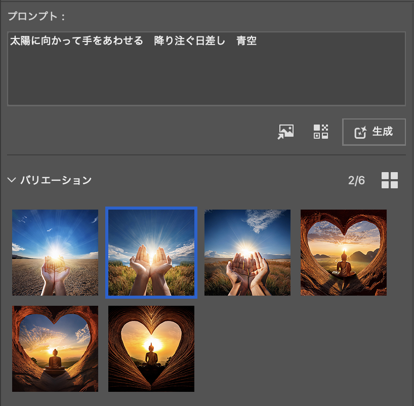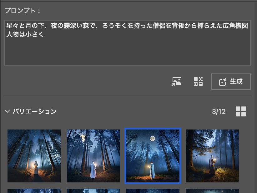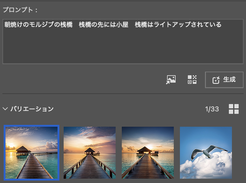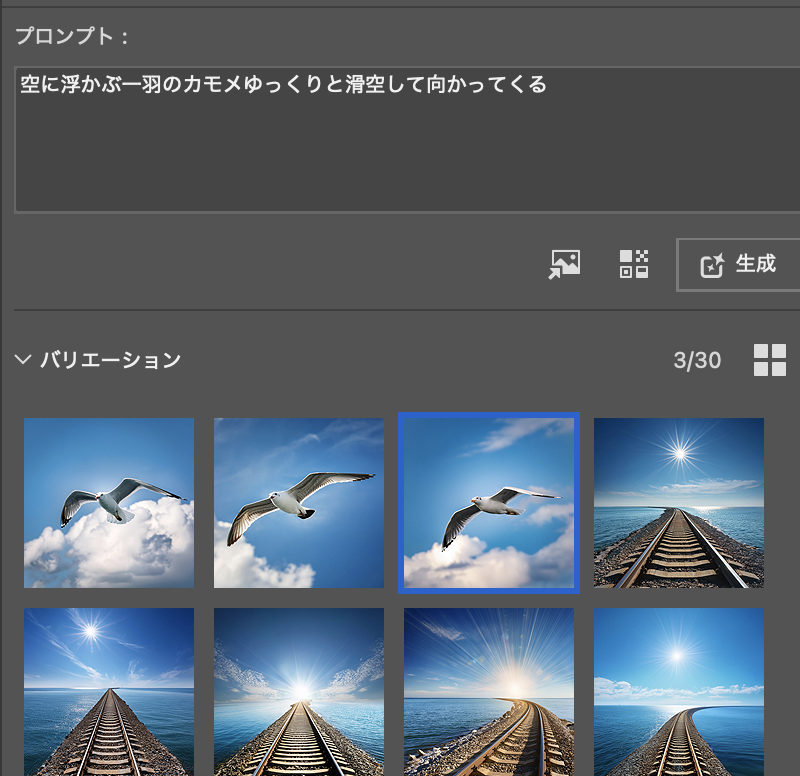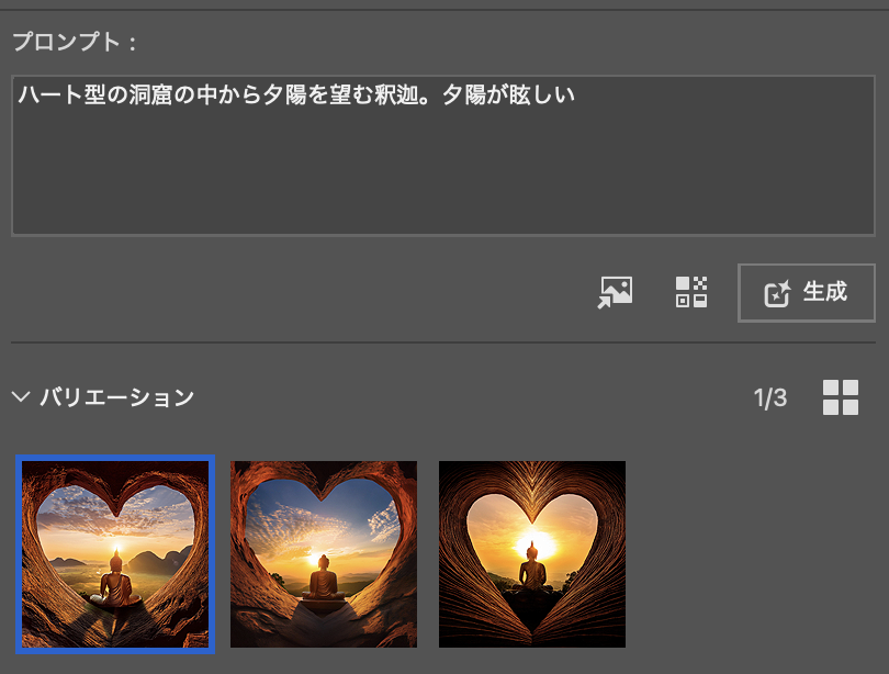 画像は3種類ずつ生成されます。イメージを見て追加でプロンプトを書き込んで再び『生成』するとまた3種出来ます。