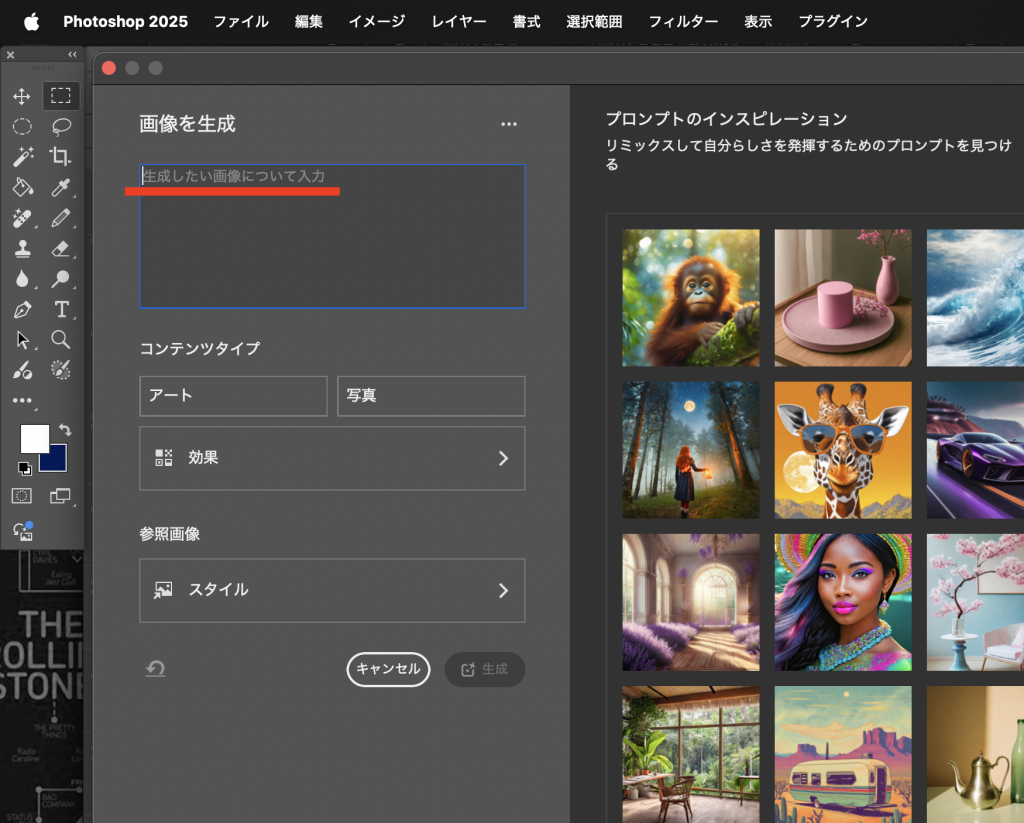 生成したい画像について入力…の欄に、作りたい画像のイメージを書いていきます。(プロンプトともいいます)プロンプトは口語でも大丈夫です 羅列でも大丈夫そうです。